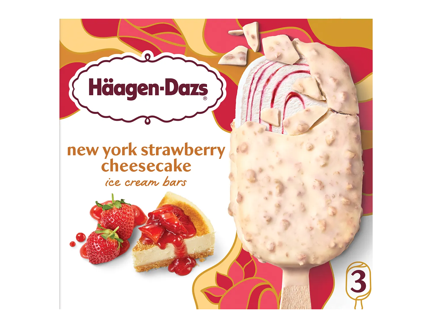 Velvety cheesecake ice cream swirled with strawberry sauce, covered in white chocolate with crunchy graham cracker crust pieces. Silky sweet with a touch of tart.